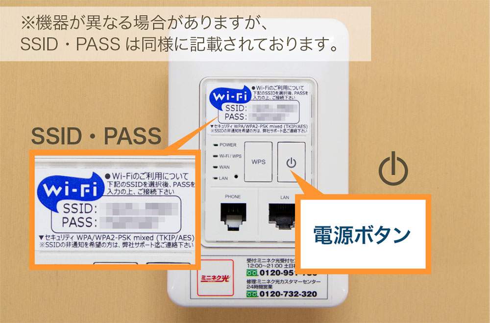 入居後、設置されている機器にSSID、passwordが記載されていますので、お手持ちのスマホなどの機器に設定をすれば、ご利用開始できます。